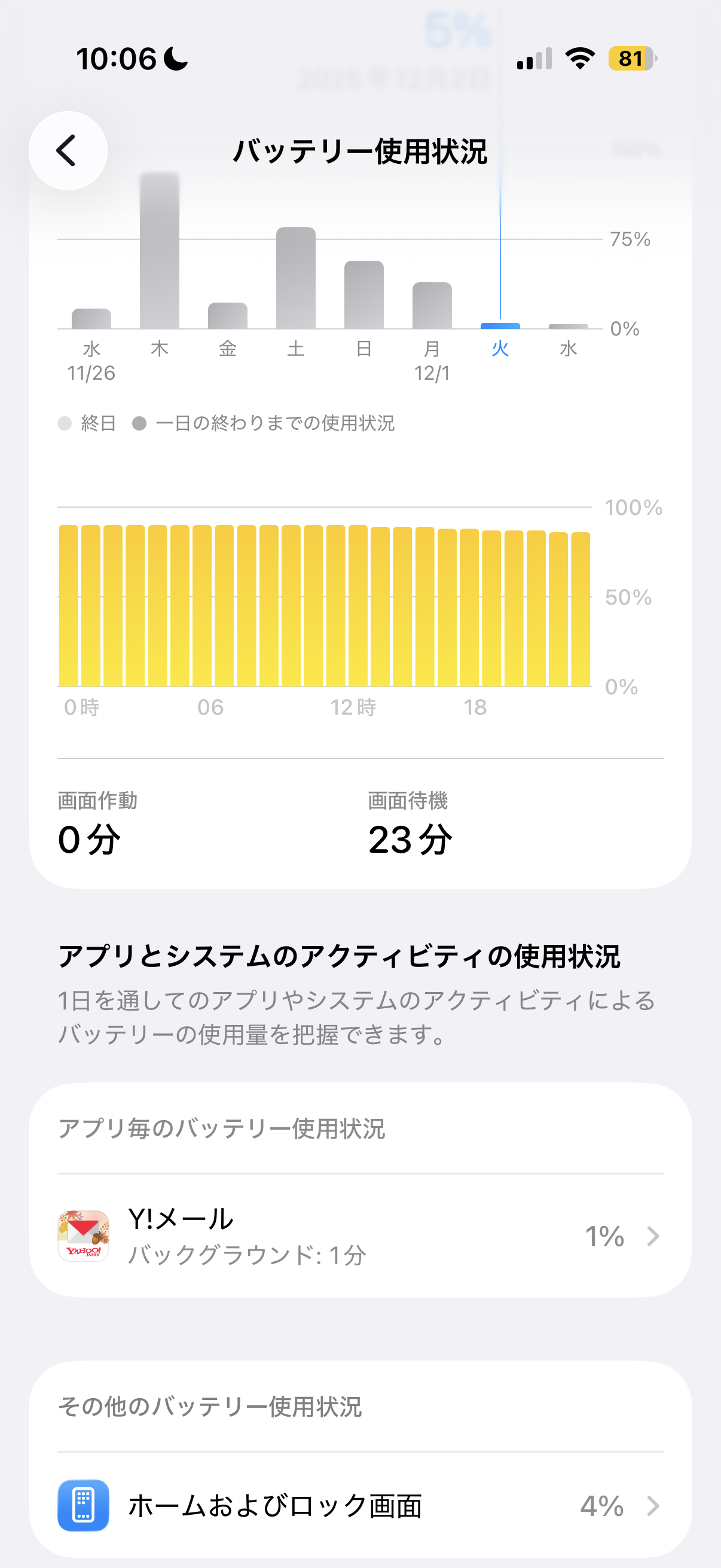 同じiOS26のiPad、iPhoneSE2で実験しましたがその2つは許容範囲の減りでした。OSのせいオンリーではなさそうです…