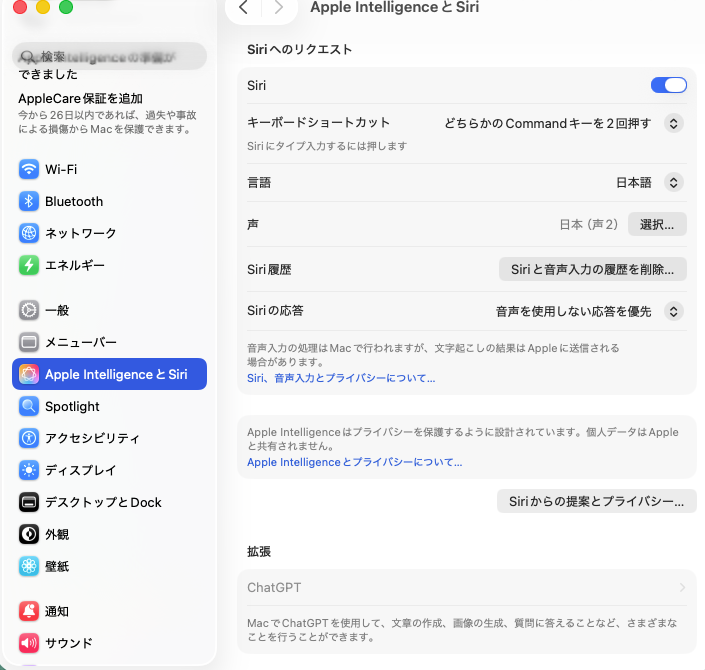 Tahoe 26.1 ChatGTPの機能拡張がグレーアウトされている