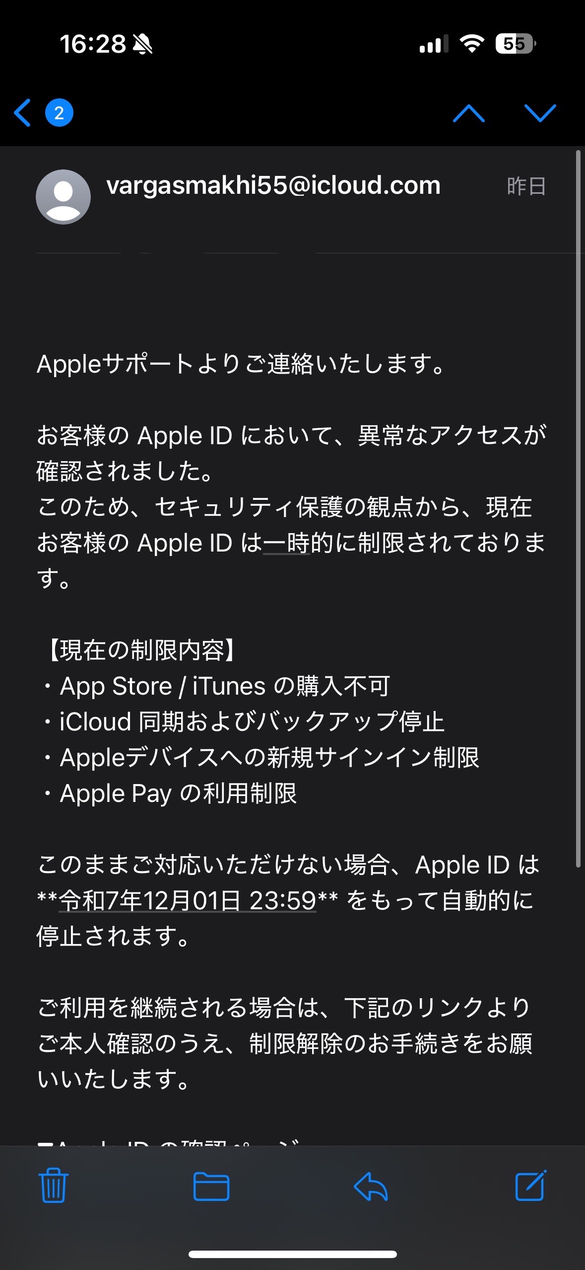ユーザのユーザプロフィール: 木藤 木藤 ユーザレベル: レベル 7 21,271 ポイント 2025/12/01 01:49 すぷーん019 への返信 お客様の Apple ID において、… - Apple コミュニティこのスレッドで言われている詐欺メールですね。 返信 リンク