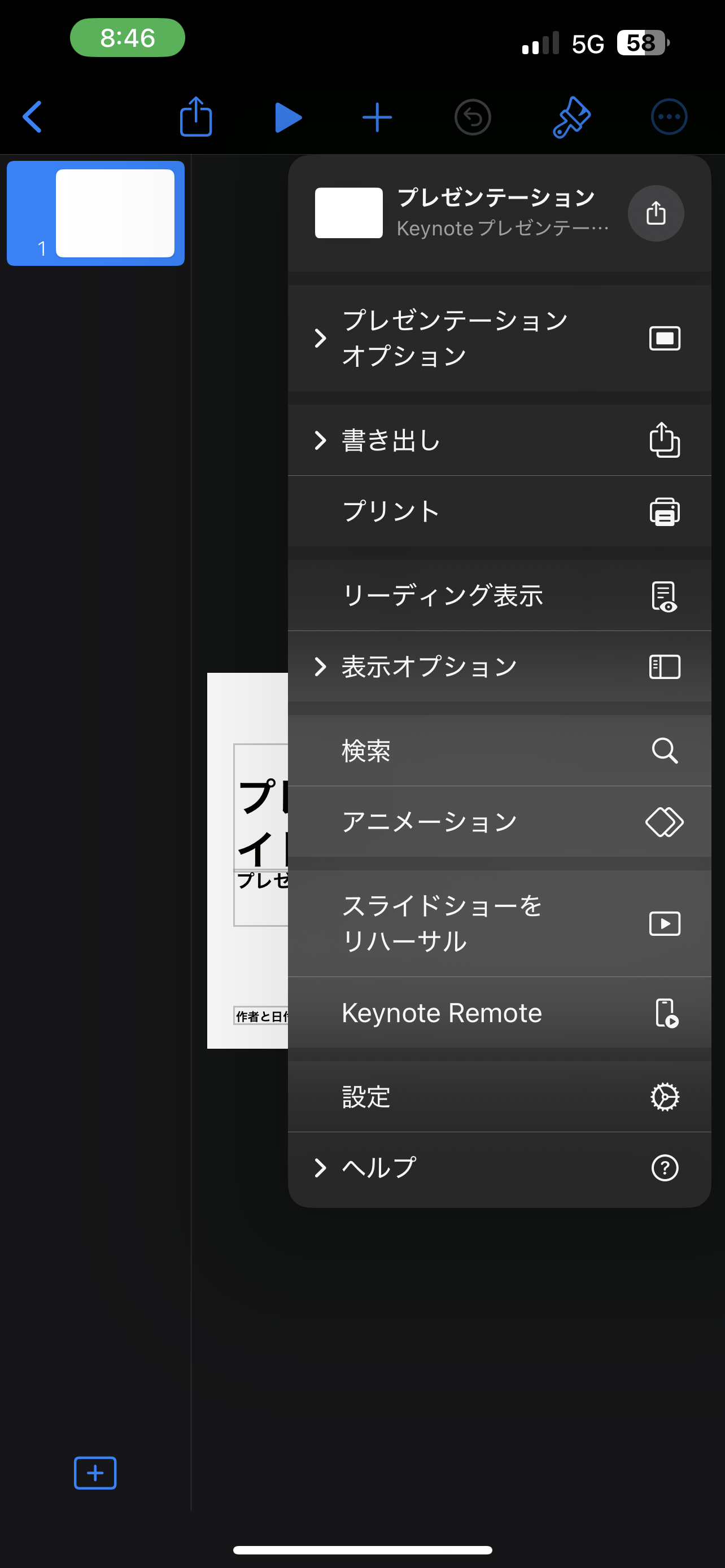 keynoteのスライドのサイズの変更の仕方がわかりません。調べたら書類設定というところが出ると書いてあるけど出てこないです。iPadでとiPhoneでもそうなります