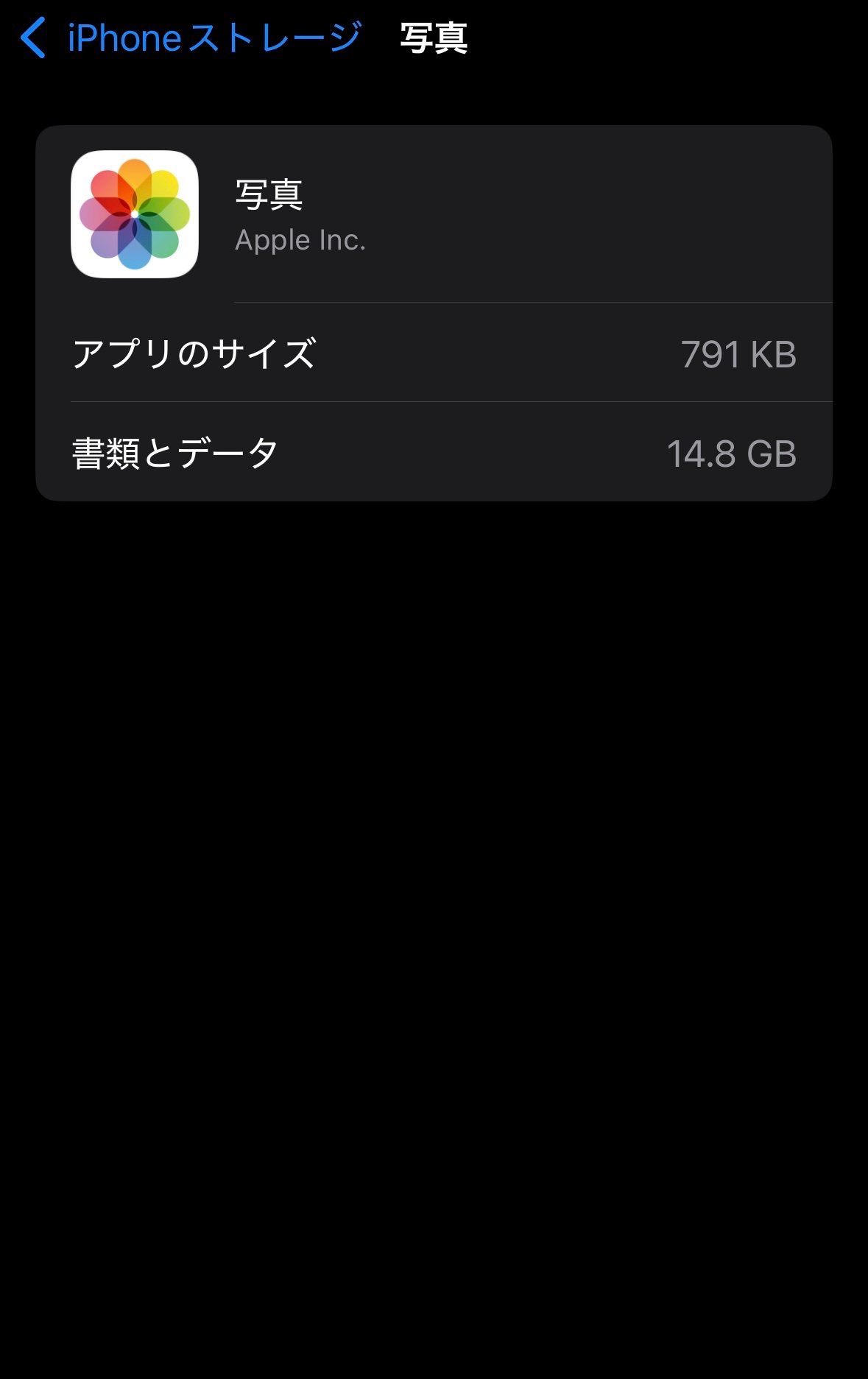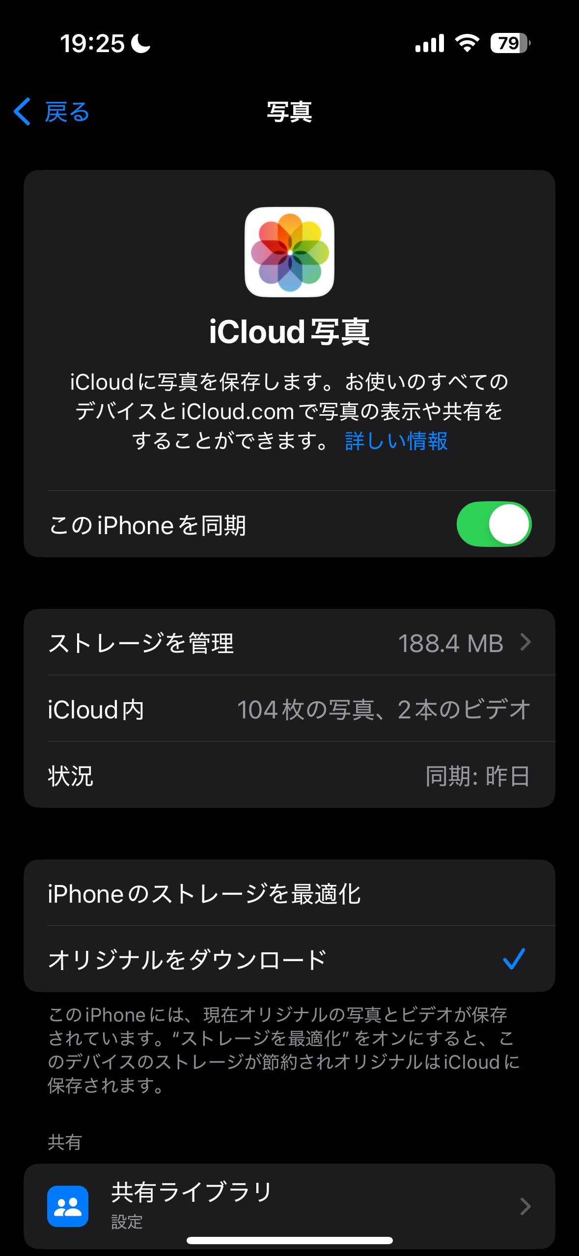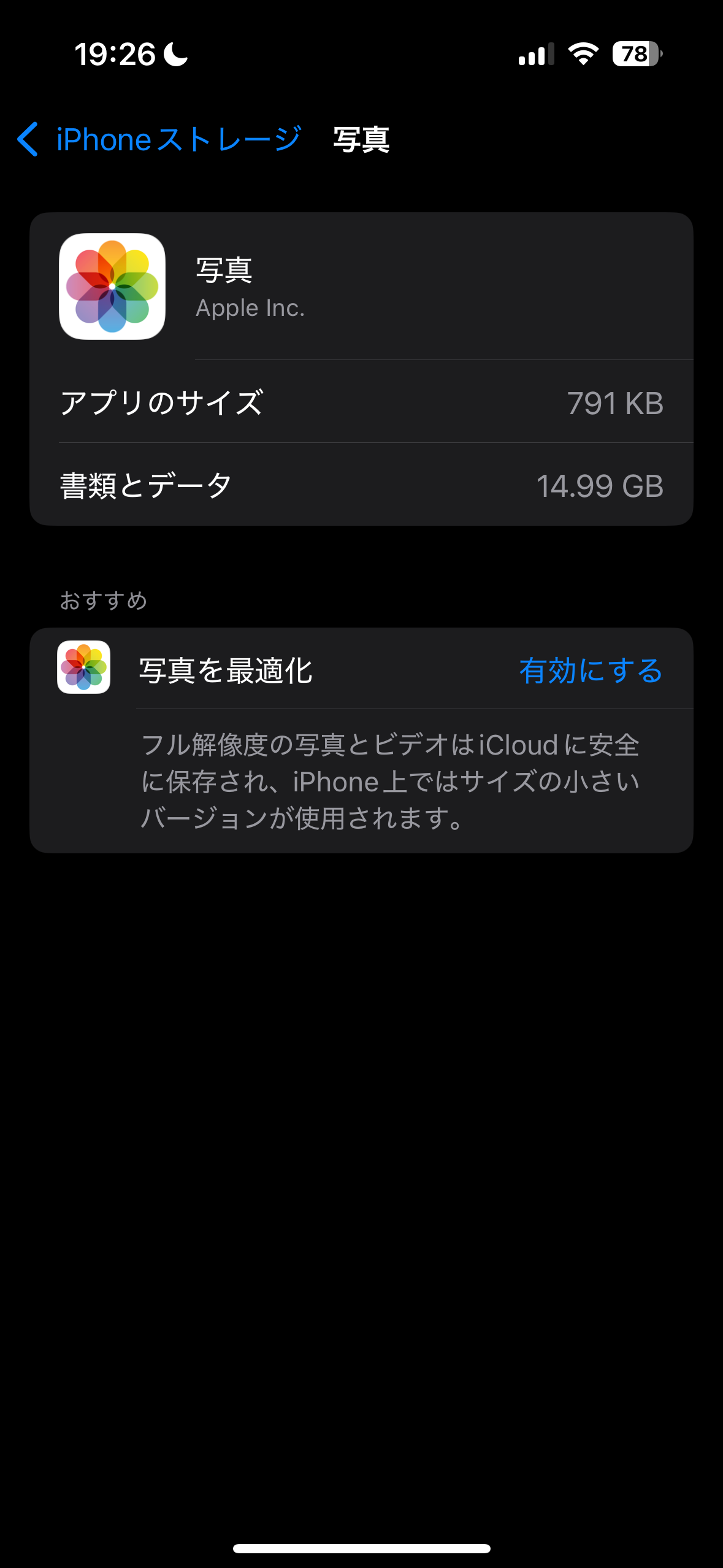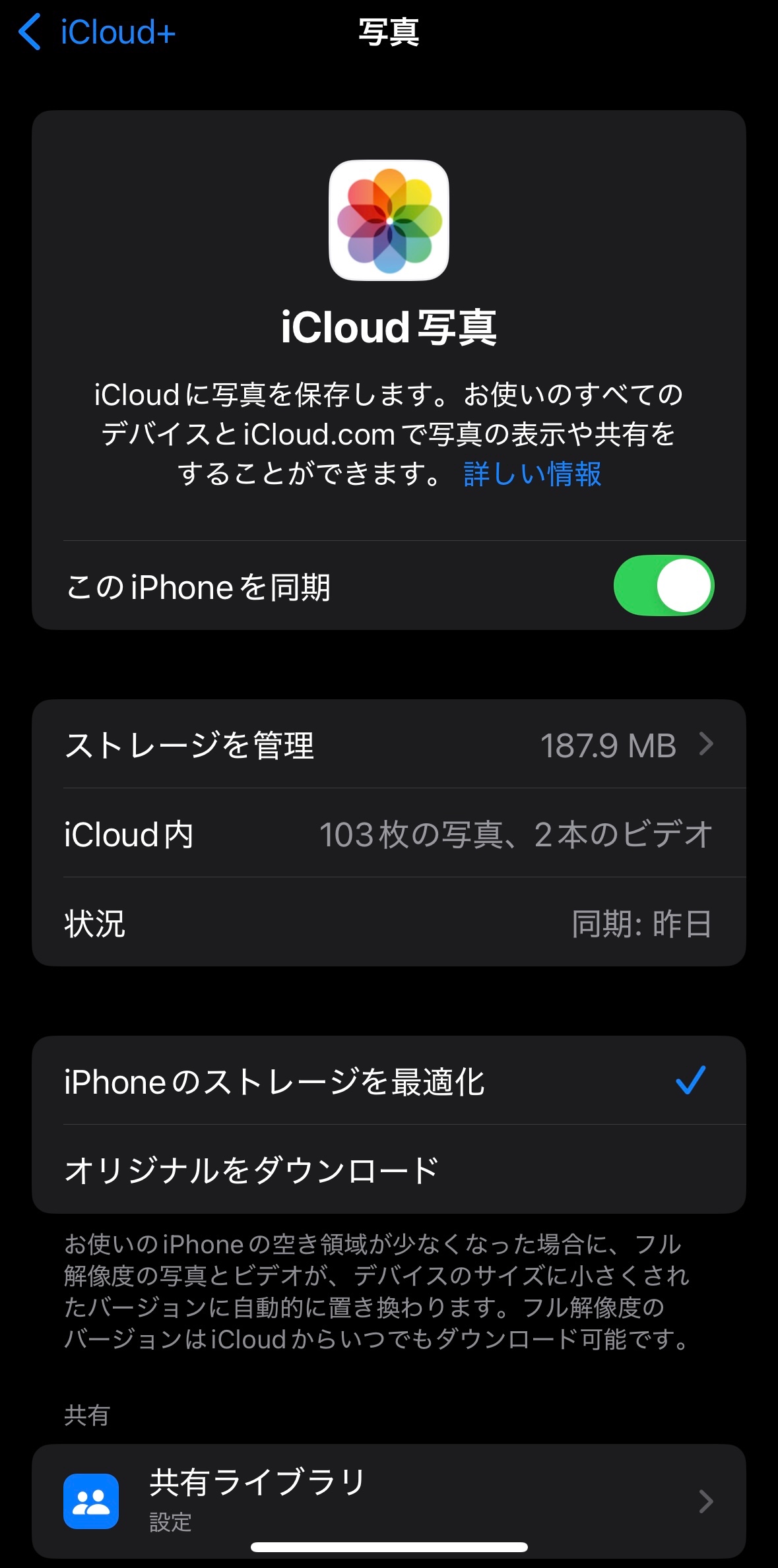 iCloud写真は使っているみたいですね。ストレージの最適化をしている場合、普通はiCloudの容量が大きくなるはずですが逆ですね。