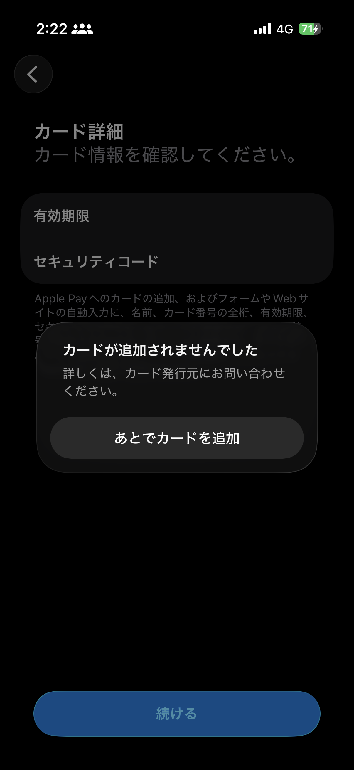 スレッドに付いたマーク ランキングトップの返信 ユーザのユーザプロフィール: 友佳子275 友佳子275 ユーザレベル: レベル 6 8,762 ポイント 2025/12/14 10:45 かなむ への返信 Apple Payで利用するカードをAppleウォレットに追加できない場合 - Apple サポート (日本) 返信 リンク
