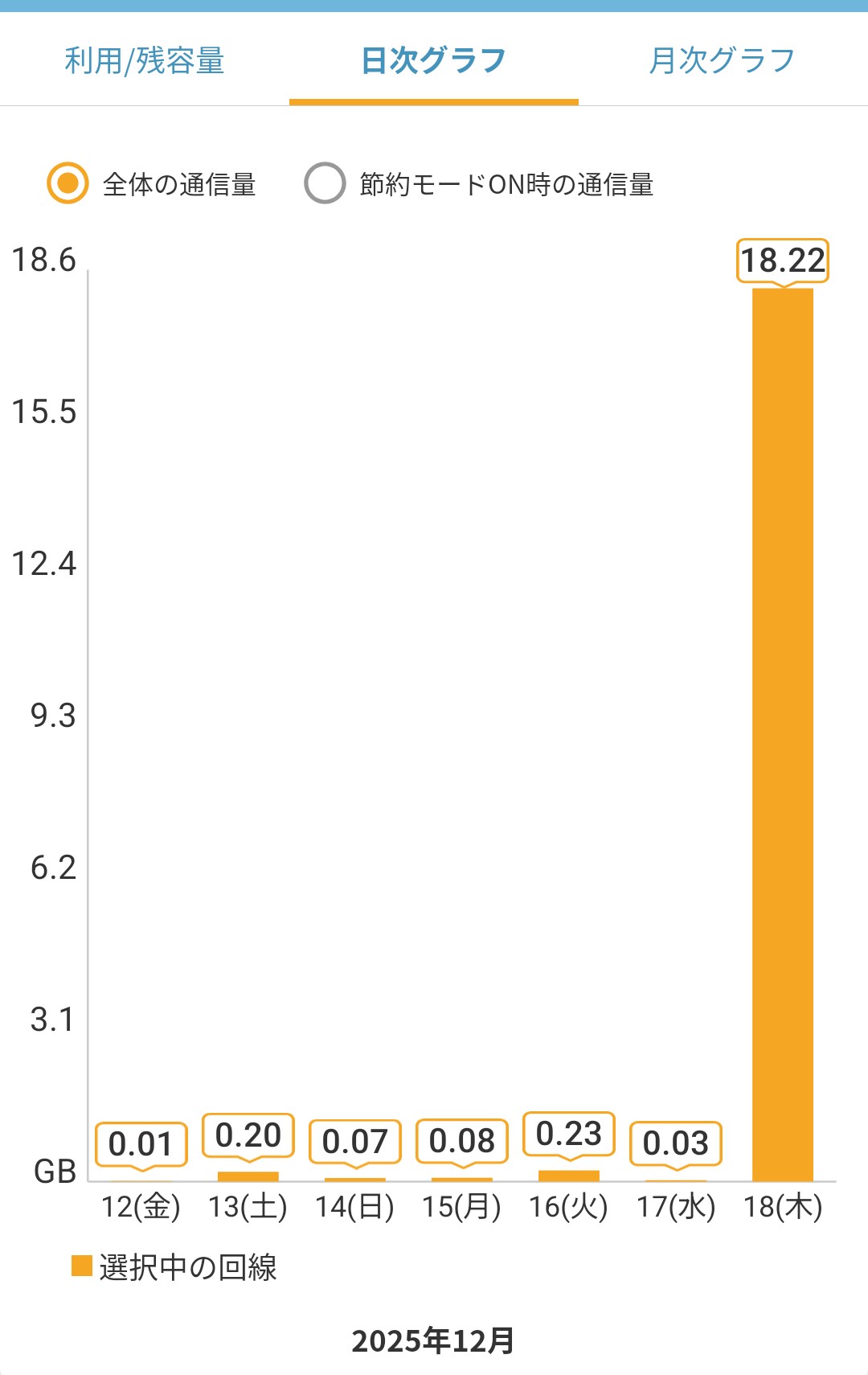 1時間で18GBという数字は、最高画質のビデオ視聴やハイレゾ再生を遥かに超える異常な数値です。アプリ側の通信リトライの暴走や、何らかのバグを疑っています。