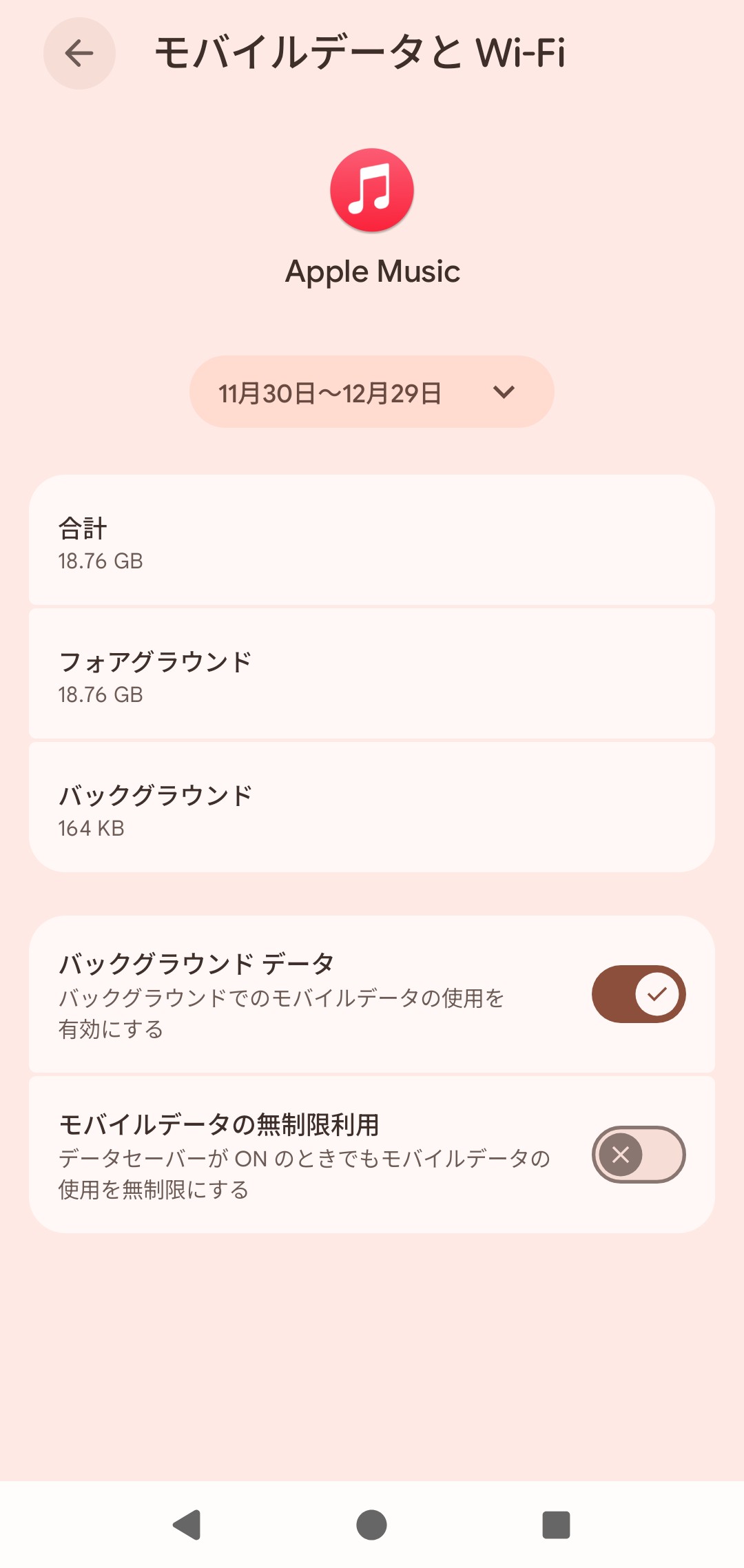 Android(Pixel)でApple Musicを使用していますが、不可解かつ深刻な通信量の消費が発生したため、同様の事例がないか、あるいはアプリの不具合の可能性があるか相談させてください。