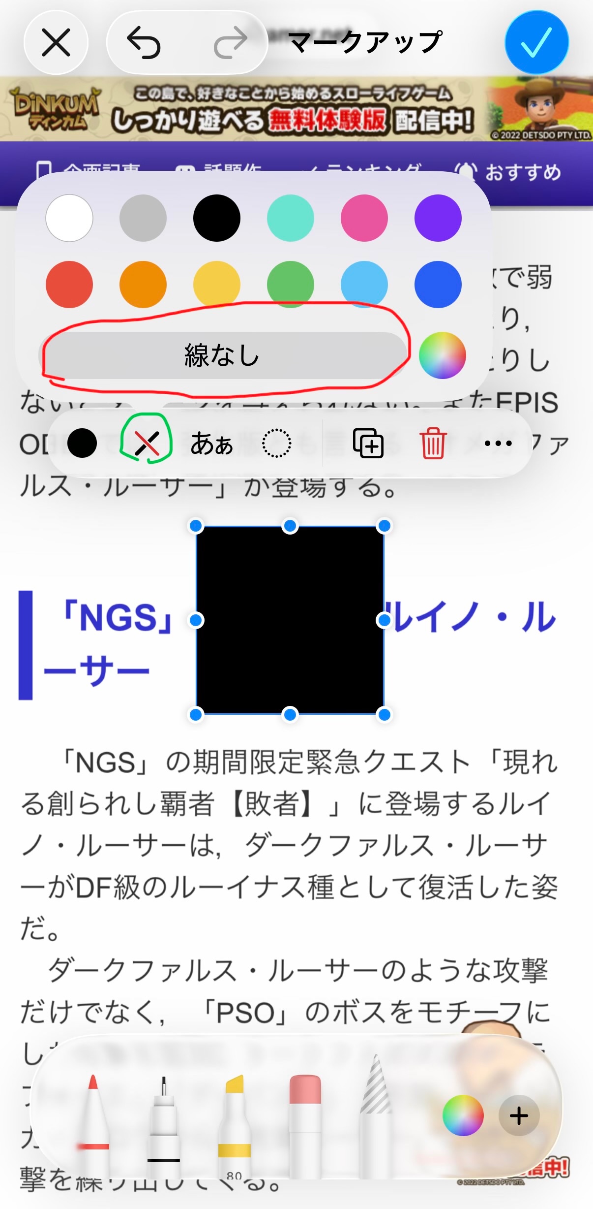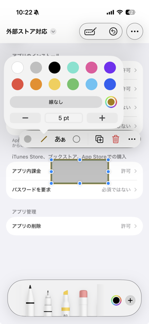 「線なし」の部分を長押ししたり、シェイプをタッチしても変わらず、編集をキャンセルして、再度マークアップを開いても+➖のタッチ項目部分は復活せず「線なし」のままでした。