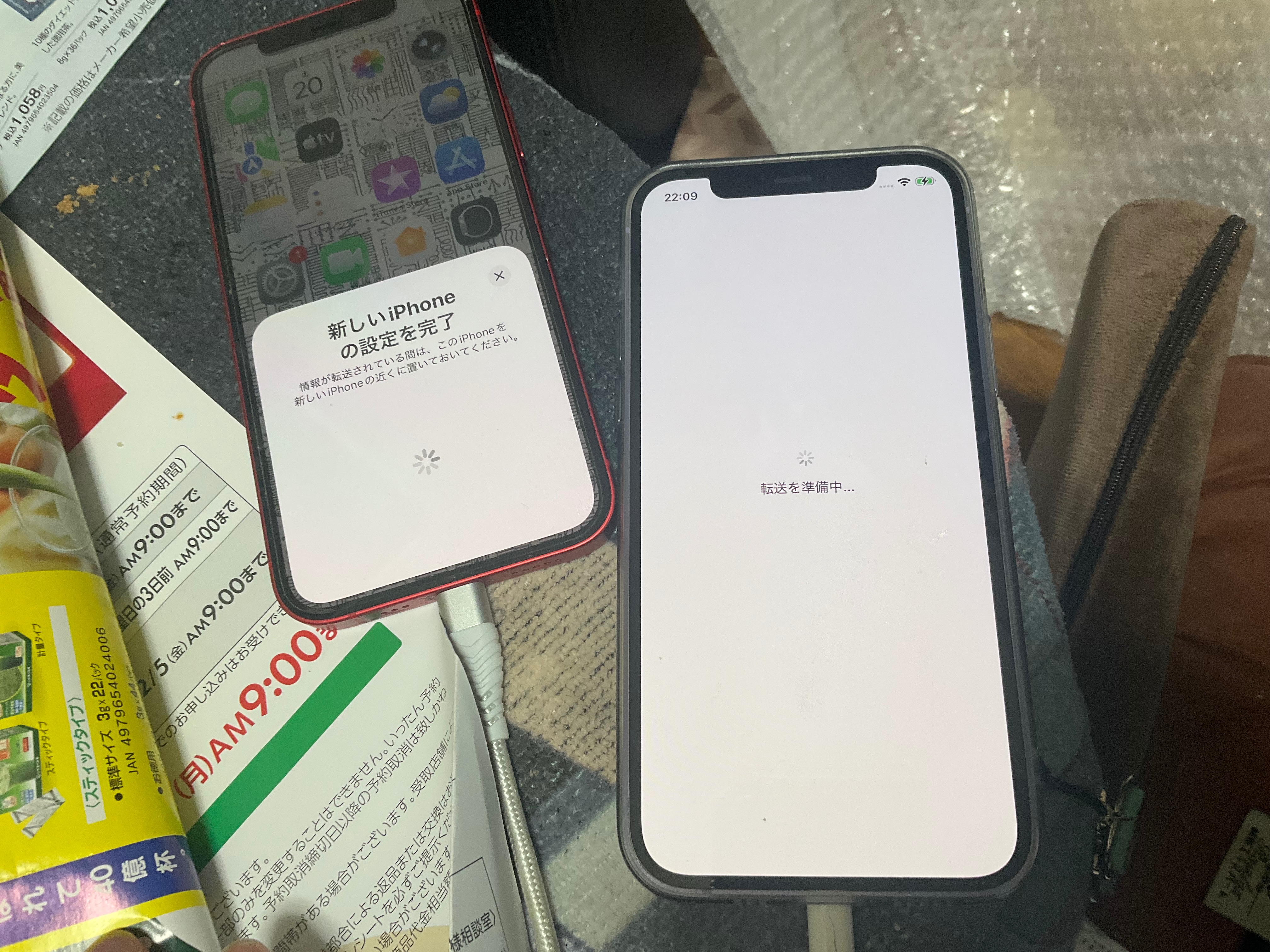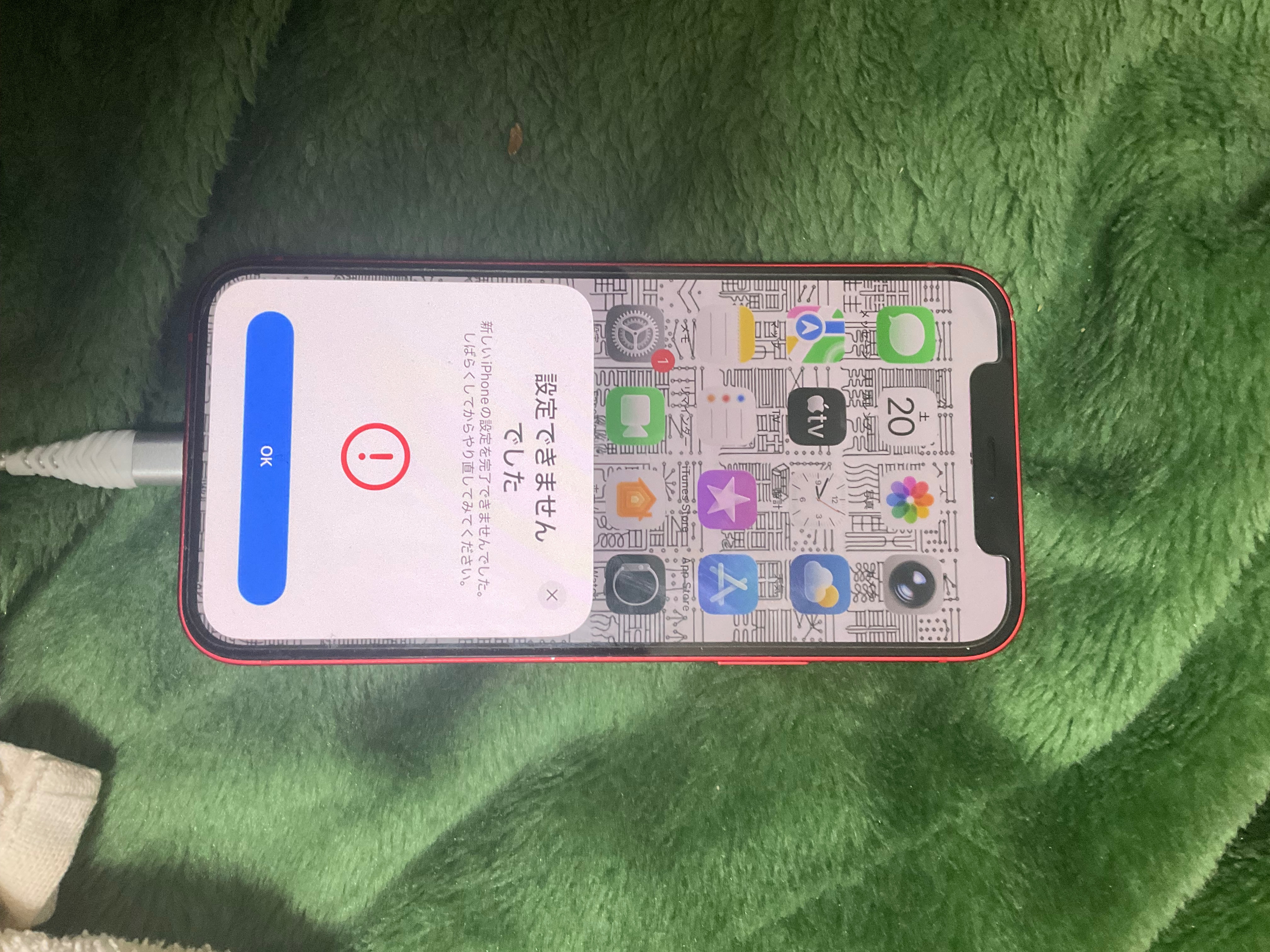 iPhone12の128GBから、同じiPhone12の256GBへクイックスタートによってデータを移行しようとしたら、旧機種の画面に「設定できませんでした」と赤い注意マークが出て失敗しました(画像は旧機種)