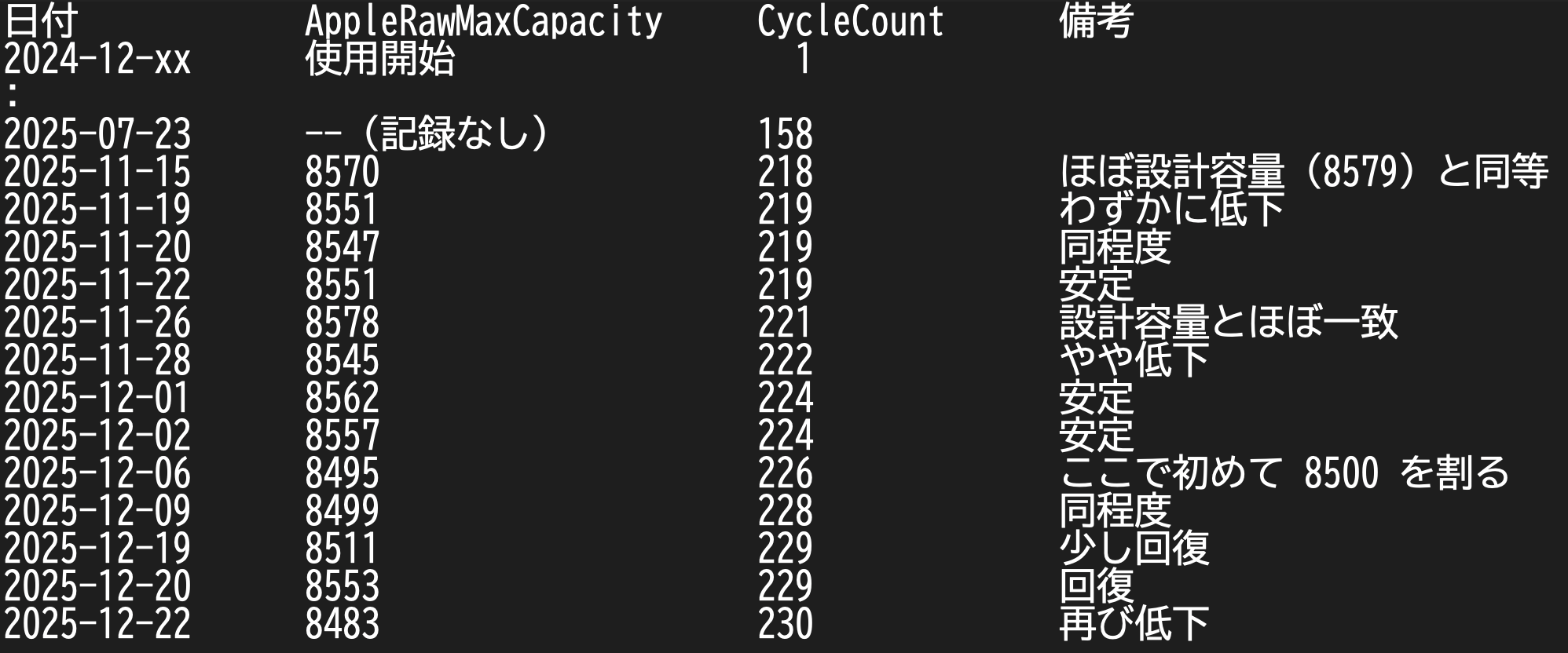 あまり気にしないで使っていけばいいということが分かってきまして、使い始めてから1年間のバッテリー状況をログにとってみてそう思いました。一応参考でした。