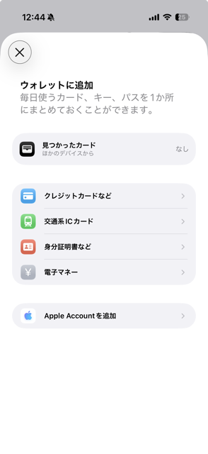 ウォレットの右上➕マークからApple accountという選択表示されません。